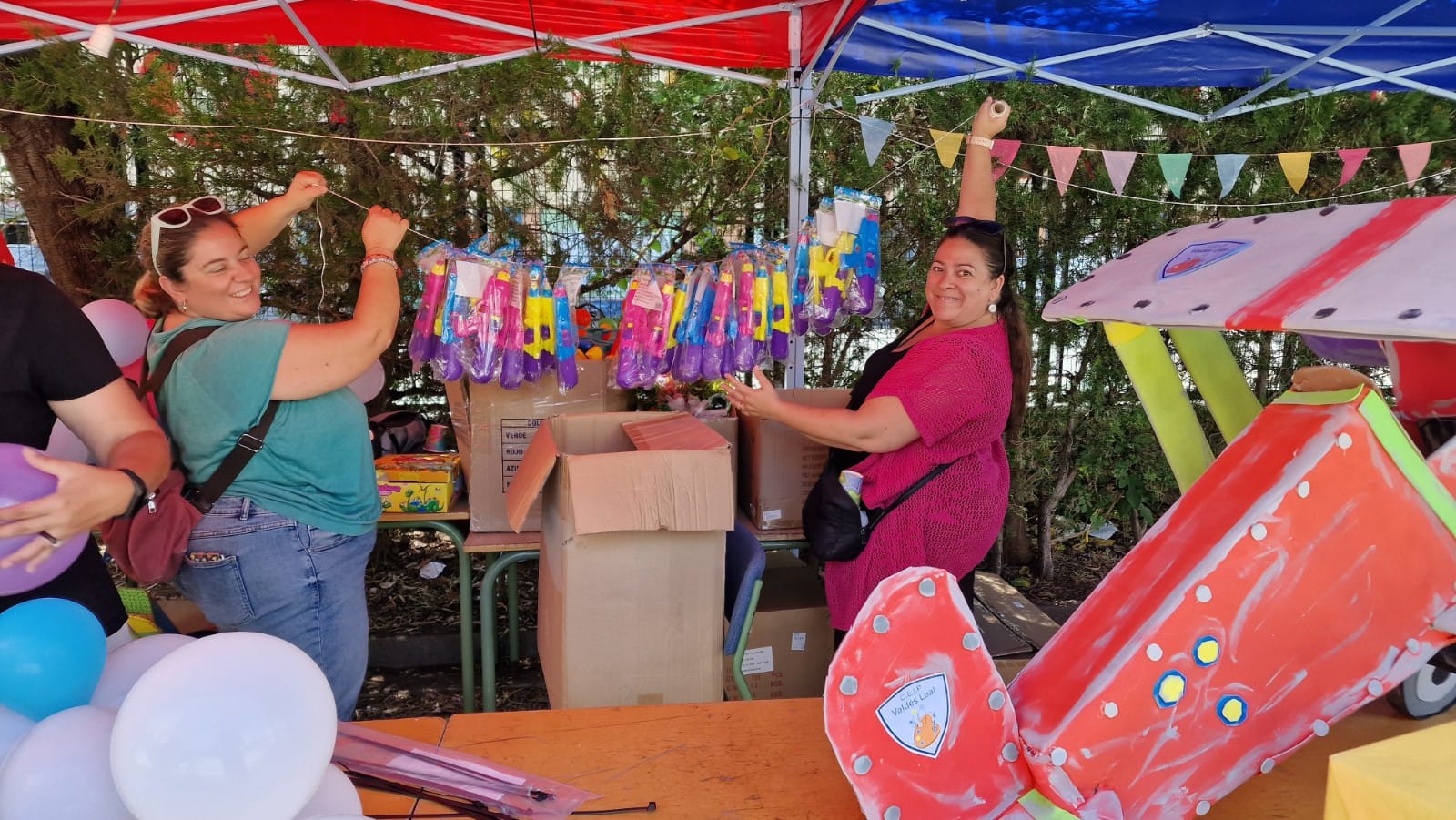 Marta y Rocío (vocal y Presidenta) dirigiendo el equipo montador de los kioskos junto a madres voluntarias, yupiiiiii